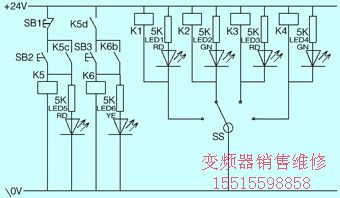 qg為整機的電源開關。fu為整機以及提供當輸出保護功能被取消后的保護。tc為繼電器k1-k6以及相應指示燈提供電源的控制電路電源變壓器。tv為220-380自耦變壓器以提供交流400v級和直流500v級之用。ss為4選1旋鈕開關,k1-k4為輸出電壓選擇控制繼電器。k5為輸出電源控制繼電器。k6為短路hl1和hl2的控制繼電器,用于取消保護后提供大電流輸出。sb1,sb2用于控制繼電器k5即電源的輸出與否,sb3用于控制繼電器k6。led1-led4既做四種輸出電壓選擇指示,兼做本機電源指示之用。led5為輸出指示用。led6用于輸出保護被取消時的指示。