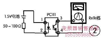 3. 光電效應(yīng)判斷法  仍以PC111光耦合器的檢測為例,檢測電路如圖2所示。將萬用表置于R×1k電阻擋,兩表筆分別接在光耦的輸出端{(lán)4}、{5}腳;然后用一節(jié)1.5V的電池與一只50~100Ω的電阻串接后,電池的正極端接PC111的{1}腳,負(fù)極端碰接{2}腳,或者正極端碰接{1}腳,負(fù)極端接{2}腳,這時觀察接在輸出端萬用表的指針偏轉(zhuǎn)情況。如果指針擺動,說明光耦是好的,如果不擺動,則說明光耦已損壞。萬用表指針擺動偏轉(zhuǎn)角度越大,表明光電轉(zhuǎn)換靈敏度越高。