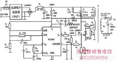 由UC3842構(gòu)成的開關(guān)電源電路如圖6所示,T為高頻變壓器。剛開機(jī)時,220V交流電先通過PNF濾掉射頻干擾,再經(jīng)過整流濾波獲得約+300V直流電壓,然后經(jīng)R2降壓后向UC3842提供+16V啟動電壓。R1是限流電阻,C1為濾波電容。正常工作后,自饋線圈N2上的高頻電壓經(jīng)過VD1、C1整流濾波,就作為UC3842的正常工作電壓。R5、C4用以改善內(nèi)部誤差放大器的頻率響應(yīng),R1是斜坡補(bǔ)償電阻。開關(guān)頻率 。C5為消噪電容,R10是過流檢測電阻,R7是VMOS開關(guān)功率管的柵極限流電阻。由C8、VD1、R11、VD2、C9構(gòu)成兩級吸收回路,用于吸收尖峰電壓。VD1和VD3選用恢復(fù)二極管FR305。VD4為輸出級的整流管,采用肖特基二極管,以滿足高頻、大電流整流之需要。