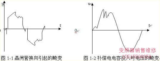 1) 晶體管換流設備對變頻器的干擾: 當供電網絡內有容量較大的晶閘管換流設備時,由于晶閘管總是在每相半周期內的部分時間導通,容易使網絡電壓出現凹凸(如圖1-1所示)。它使變頻器輸入側的整流電路有可能因此出現較大的反向回復電壓而受到損害。