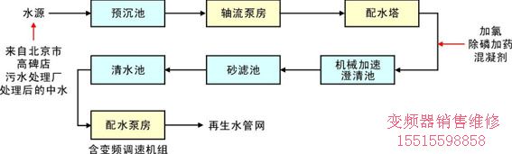 第六水廠經(jīng)過改造后,改為再生水廠,設計供水能力為17萬m3/日。由于再生水的使用仍屬于使用初期,再加上再生水管網(wǎng)還未形成規(guī)模,因此實際用水量初期僅為1.7萬m3/日,此時開始使用變頻器調(diào)速機組,實現(xiàn)了供水的靈活性。