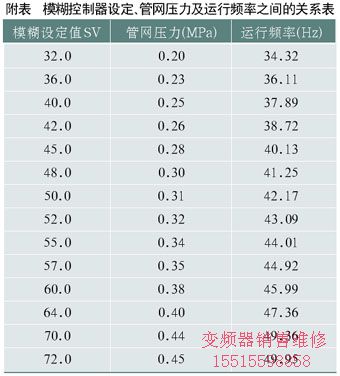 4.2 模糊控制器設定、管網(wǎng)壓力及運行頻率之間的關系表(如附表所示)