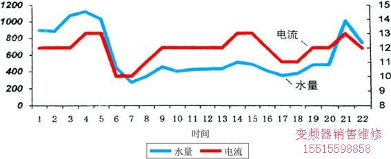 未使用變頻器時電機運行電流平均值為23a,使用變頻器電機電流平均值為10a使用變頻器節(jié)電率約為40%左右。