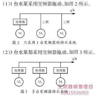 8)多臺水泵并聯(lián)恒壓供水(例如城市自來水廠的清水泵、中大型水泵站、供熱水中心站等)的變頻技術(shù)改造方案常見的有以下兩種。