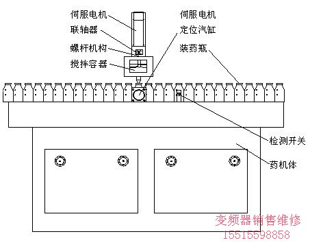間歇式螺桿分裝機(jī)是通過(guò)伺服電機(jī)驅(qū)動(dòng)螺桿,將藥品“擠出”攪拌容器,灌裝于藥瓶?jī)?nèi)。由于劑量需要準(zhǔn)確的控制,因此要求伺服電機(jī)每次分裝時(shí)轉(zhuǎn)同樣的圈數(shù)。具體的旋轉(zhuǎn)圈數(shù)則是由操作者由手動(dòng)方式試驗(yàn)出來(lái)的,因此,程序不僅要能夠提供可以讓操作者更改的裝藥量,還要提供手動(dòng)操作裝藥量的操作方式。當(dāng)一個(gè)藥瓶需要被添裝時(shí),定位汽缸會(huì)驅(qū)動(dòng)一個(gè)定位器將被添裝藥瓶卡在攪拌機(jī)的出口下,這時(shí)傳動(dòng)帶雖然繼續(xù)運(yùn)動(dòng),但由于藥瓶被定位其卡緊,所以藥瓶將不隨傳動(dòng)帶運(yùn)動(dòng),直到添裝完畢,定位器松開(kāi),藥瓶才會(huì)繼續(xù)跟隨傳送帶運(yùn)動(dòng),直到進(jìn)入扣塞機(jī)構(gòu)。圖1是間歇式螺桿分裝機(jī)的結(jié)構(gòu)示意圖。