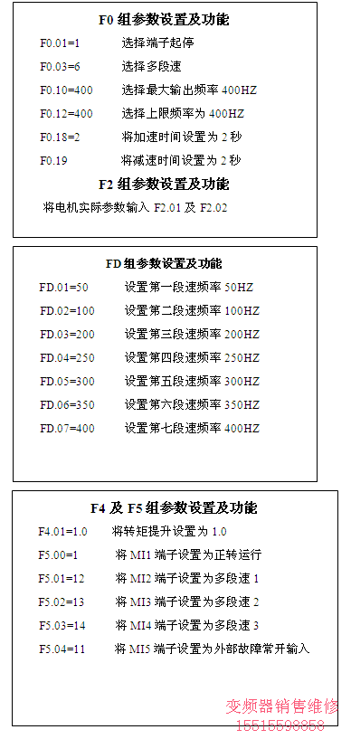 根據(jù)現(xiàn)場(chǎng)生產(chǎn)要求,將參數(shù)F0.18和F0.19設(shè)置成2秒(加減速時(shí)間),因運(yùn)行轉(zhuǎn)速較高,變頻器需帶制動(dòng)單元。系統(tǒng)在50HZ,100HZ,200HZ,250HZ,300HZ,350HZ,400HZ這七段速度頻率下,運(yùn)行穩(wěn)定,400HZ(對(duì)應(yīng)24000RPM)時(shí)溫升低,可以有效延長(zhǎng)電機(jī)的壽命。