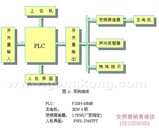 控制系統(tǒng)由PLC,變頻器,人機(jī)界面,I/O接口等部分組成。