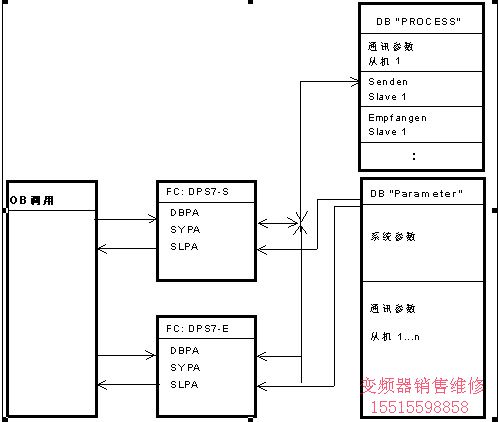 采用DVA-S7編制程序,主要組成部分為:DP-SEND(參數(shù)發(fā)送功能塊),DP-RESV(參數(shù)接收功能塊),過(guò)程參數(shù)數(shù)據(jù)塊,通訊參數(shù)數(shù)據(jù)塊。通訊功能塊需要兩個(gè)數(shù)據(jù)塊,進(jìn)行過(guò)程參數(shù)化和提供通訊參數(shù)存取空間。它們之間關(guān)系如下圖所示: