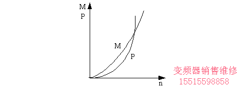 根據(jù)流體力學相似原理流量Q∝n轉(zhuǎn)速,壓力H∝n2,功率P∝n3,因此只要略有降速,功率下降幅度很大。水泵、風機屬平方轉(zhuǎn)矩下降負載特性見圖,因此要選用的變頻器必需與之相匹配,可選用v/f控制并具有節(jié)能型的水泵、風機類變頻器更為合適。