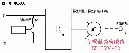 ①當(dāng)電機(jī)在減速時(shí)電機(jī)以發(fā)電狀態(tài)運(yùn)行,產(chǎn)生再生能量。電機(jī)處于發(fā)電狀態(tài)時(shí),其產(chǎn)生的三相交流電被逆變部分的六個(gè)續(xù)流二極管組成的全橋整流,使變頻器內(nèi)直流中間環(huán)節(jié)的直流電壓升高。