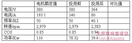 變頻調(diào)速器投用后,控制回路的穩(wěn)定性和可靠性比調(diào)節(jié)閥有明顯提高,控制偏差保持在±1%以內(nèi),被控參數(shù)波動幅值較小。電機在變頻調(diào)速器的控制下保持中速運行狀態(tài)。在電機啟動、控制過程中實行延時斜升、斜降,并且有輸出短路、欠壓、過流、過載過熱等報警跳閘及在線故障診斷功能,保證其運行安全可靠,降低故障率,減少了設備損耗,尤其顯著的是節(jié)能效果相當明顯。在正常工況下,投用前后的電氣參數(shù)如下: