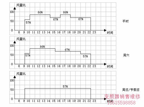 下圖所示為某大樓不同工作時(shí)段內(nèi)(平時(shí)、周六、周日或節(jié)假日)風(fēng)量需求量,該風(fēng)量必須二氧化碳濃度等環(huán)境標(biāo)準(zhǔn)來(lái)確定比較少必需量。通常設(shè)計(jì)中都留有一定余量,可以按高速時(shí)86%、中速時(shí)67%、低速時(shí)57%進(jìn)風(fēng)量來(lái)進(jìn)行多段速控制。