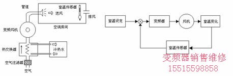 大型空調(diào)大樓中,所需要空氣量是樓內(nèi)人數(shù)及晝夜大氣溫度變化而不同,相應(yīng)對(duì)風(fēng)量進(jìn)行調(diào)節(jié)可以減少輸入風(fēng)扇電能并調(diào)整主機(jī)熱負(fù)載。人少時(shí),如周末、星期日、節(jié)假日,空氣需求量少。考慮這些具體情況來(lái)改變吸氣扇轉(zhuǎn)速,控制進(jìn)風(fēng)量,可減少吸氣扇電機(jī)能耗,同時(shí)還可以減輕輸入暖氣時(shí)鍋爐熱負(fù)載和輸入冷氣時(shí)制冷機(jī)熱負(fù)載。