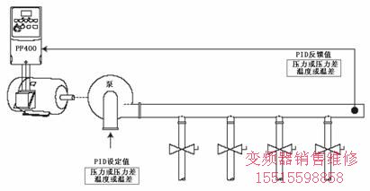 從以上分析可以知道,中央空調(diào)水循環(huán)系統(tǒng)變頻控制一般都采用恒壓力差或恒溫差閉環(huán)控制,PF400變頻器有一個(gè)內(nèi)置PID控制回路,用來(lái)使過(guò)程反饋壓力差或溫度差與設(shè)定值保持一致。具體示意如圖二: