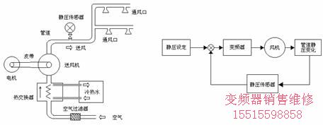 送風(fēng)機(jī)空氣處理裝置是采用冷熱水來(lái)調(diào)節(jié)空氣溫度熱交換器,冷、熱水是冷、熱源裝置對(duì)水進(jìn)行加溫或冷卻而到。大型商場(chǎng)、人員較集中且面積較大場(chǎng)所常使用此類裝置。圖一所示給出了一個(gè)空氣處理裝置中送風(fēng)機(jī)靜壓控制系統(tǒng)。
