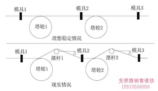 穩(wěn)定運(yùn)行過程中,我們將條件理想化(排除其他不穩(wěn)定因素的影響),擺桿將停在設(shè)定的位置不出現(xiàn)波動(dòng),塔輪只需要按照計(jì)算出來的理論線速度運(yùn)行就可以保證絲線張力恒定,此過程只需要知道每級(jí)牽伸機(jī)構(gòu)中塔輪的理論線速度即可;由于機(jī)械一旦制造完成,塔輪的直徑以及電機(jī)端的減速比就已經(jīng)確定,從塔輪的理論線速度就可以計(jì)算出電機(jī)的實(shí)際運(yùn)行轉(zhuǎn)速,也就是變頻器需要運(yùn)行的頻率。