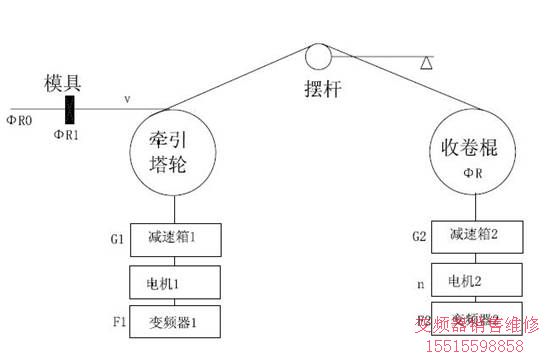 由于并列式拉絲機(jī)由11組牽伸機(jī)構(gòu)和1組收卷機(jī)構(gòu)組成,所以我們單獨(dú)對一組牽伸機(jī)構(gòu)和一組收卷機(jī)構(gòu)來進(jìn)行控制原理的分析。圖3為一組牽伸機(jī)構(gòu)的結(jié)構(gòu)示意圖。