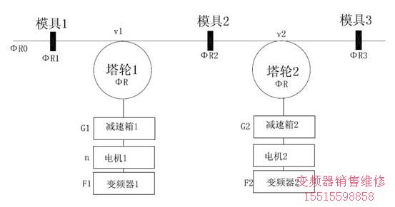 圖4中假設(shè)塔輪直徑為R,模具1直徑為R1,模具2直徑為R2,模具3直徑為R3,進(jìn)線直徑為R0,電機(jī)1減速齒輪比為G1,電機(jī)2減速齒輪比為G2,變頻器1指令頻率為F1,變頻器2指令頻率為F2,塔輪1上的線速度為v1,塔輪2上線速度為v2,n為電機(jī)1轉(zhuǎn)速,s為電機(jī)1轉(zhuǎn)差率,p為電機(jī)1級(jí)對數(shù),t為時(shí)間。G1定義為(負(fù)載側(cè)齒輪10-24/電機(jī)側(cè)齒輪10-23)。