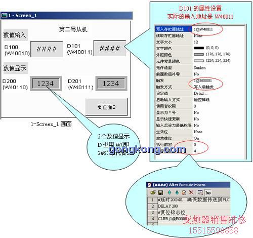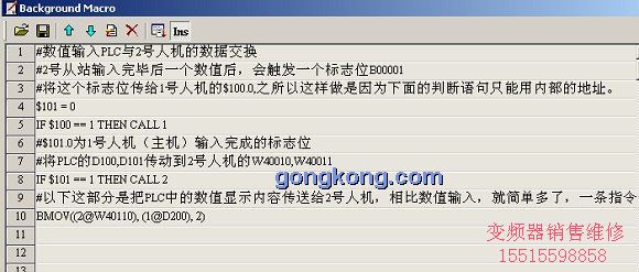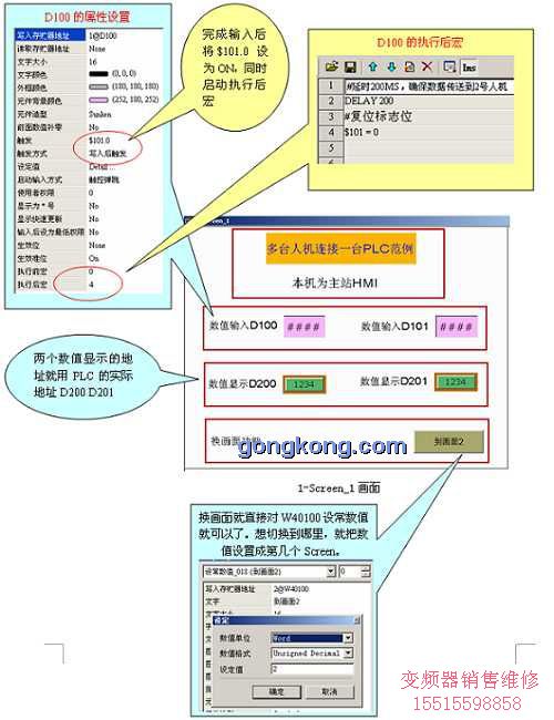 本功能實(shí)現(xiàn)關(guān)鍵是主從機(jī)都可以改變PLC中的數(shù)據(jù)。設(shè)PLC中的寄存器地址為D100, D101。2#Slave HMI與之相對(duì)應(yīng)的地址是W40010, W40011。我們的思路是這樣:當(dāng)1#Master HMI完成對(duì)D100, D101的數(shù)值輸入的時(shí)候,觸發(fā)一個(gè)標(biāo)志位1#$101.0(1#表示1#Master,2#表示2#Slave HMI)。在1#backgroud宏中檢查$101如果為1,就Call子宏2,在子宏2中用BMOV指令把D100, D101分為傳送給2#W40010, 2#W40011以達(dá)到數(shù)據(jù)同時(shí)改變。同時(shí)啟動(dòng)D100, D101的執(zhí)行后宏,先做200ms延時(shí),之后復(fù)位$101.0.