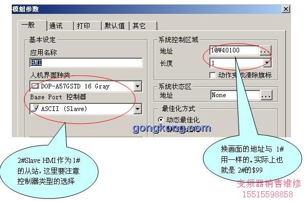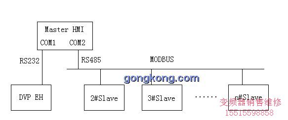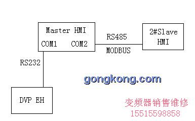 上圖中1#Master HMI的COM1連接DVP PLC,作為PLC的主站。