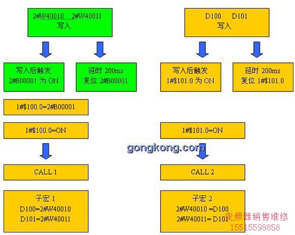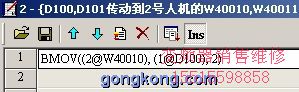 同樣的做法,當(dāng)2#完成對(duì)2#W40010, 2#W40011數(shù)值輸入后觸發(fā)標(biāo)志位2#B00001。因?yàn)樵?#backgroud宏的IF語(yǔ)句中不能直接使用BasePort或者Link2的地址,所以要先把2#B00001GET到$100.0,之后在在1#backgroud宏中檢查$100如果為1,就Call子宏1,在子宏1中用BMOV指令把2#W40010, 2#W40011分為傳送給D100, D101以達(dá)到數(shù)據(jù)同時(shí)改變。同時(shí)啟動(dòng)2#W40010, 2#W40011的執(zhí)行后宏,先做200ms延時(shí),之后復(fù)位2#B00001。