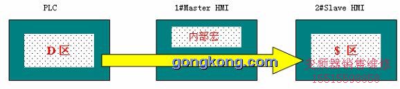 功能1:兩臺(tái)HMI同時(shí)顯示PLC的數(shù)據(jù)變化。DOP有個(gè)很大的特點(diǎn)就是支持宏指令功能,所以這些功能都要依靠宏來(lái)實(shí)現(xiàn)。我們先設(shè)功能1中PLC用到的寄存器地址為D200, D201。2#Slave HMI與之對(duì)應(yīng)的地址設(shè)為$109, $110,根據(jù)表1DOP內(nèi)部與MODBUS的對(duì)應(yīng)關(guān)系可以知道對(duì)應(yīng)MODBUS的地址為W40110, W40111。然后在Master HMI中用BMOV指令將D區(qū)傳送給$區(qū)就行了。