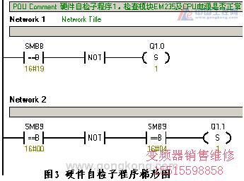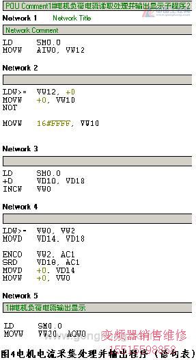3.2 PLC系統控制流程 控制主程序分別調用三組子程序,依次進行PLC系統上電的硬件自檢、控制器件初始化、模擬量數據采集輸出處理,然后進入電氣聯鎖自動控制運行程序。其中,硬件自檢子程序通過讀取系統信息,主要檢測作為第一擴展模塊的模擬量模塊EM235是否已經可靠鏈接,模塊自身是否存在故障,CPU模塊提供給擴展單元的DC24V電源是否正常,硬件自檢子程序LAD見圖3。初始化子程序,對控制器件進行初始化,復位清零,避免程序內部寄存干擾,以保證程序穩(wěn)定運行。模擬量數據采集輸出處理子程序組包括四個子程序:分別是1#和2#水泵電機的負荷電流讀入處理及輸出顯示子程序和電機繞組溫度檢測子程序。因為1#、2# 電機電流和繞組溫度共4點模擬量的采集輸入地址不同,所以在控制程序的編寫上要一一給出,但是實際運行中任意時刻只有一臺水泵在工作,因此只有一臺電機的相關數據處理的兩個子程序在運行。程序的執(zhí)行時間也是有保證的。 在該控制系統中,電機的運行電流和繞組溫度兩個模擬量的檢測,不僅僅是控制參數的采集顯示,以供操檢人員觀察判斷系統運行狀態(tài);而且通過西門子S7-200PLC對兩參數是否異常的辨別判斷,據此發(fā)出警示指明故障類型,同時決定泵的停止與投用,直接參與系統控制。 3.3電機運行參數的采集和控制功能的實現 在控制主程序的初始化子程序中,預置電機電流和繞組溫度兩模擬量的采樣計數器頻次,為增加數據穩(wěn)定性而采取多次采樣累積后求平均值,因此相關運算寄存器要預先清零。然后,系統在通過擴展單元故障檢測后,即進行模擬量采集處理。又分兩個子程序獨立進行電機負荷電流和繞組溫度的采樣、運算、輸出和判斷。均為采用多次采樣求和,通過移位除法求出平均值。不同的是電流值(寄存于VW20)一方面經傳輸指令由EM235的輸出通道AQW0輸出顯示,該部分控制程序STL見圖4;另一方面作為水泵是否有效運行的狀態(tài)檢測,以此判斷電機故障和啟用備用泵。電機繞組溫度,作為控制級別較高的參數,經過采集處理,由比較指令結合定時指令進行判斷,若溫升出現異常,即迅速停止電機運行。 系統控制程序中,多處結合使用定時指令,增強了系統穩(wěn)定性。例如:自耦降壓變壓器不允許頻繁通電,利用定時器功能設定同一臺水泵在間隔十分鐘以后,方能再次啟動。檢測電機負荷電流,以判斷電機是否真正在運行時,為避開外部接觸器、繼電器的動作時間,防止檢測失誤,啟用一5秒的定時器,有效的保證了信號的可靠性,從而使下一步的CPU判斷并決定是否啟用另一臺水泵,提供可靠的依據。通過設定比較參數值,檢測電機實際運行電流若長時間(一般可設為30分鐘)大于1.1~1.2倍電機Ie時,可停止運行該泵,排查原因,以免損壞電機,從而替代傳統的過載保護裝置。同時可發(fā)訊啟動備用泵。由于電機繞組溫度參數的特殊性,電機又是水浸式冷卻,它不可能突變,因此在采樣頻率不變的情況下,對處理后的溫度數據每五分鐘檢測比較一次,當大于所設定的溫升值時即發(fā)出警示和停機,并啟動另一泵,完全滿足要求。不管電機電流過載與否,若電機溫度急劇升高,超出正常允許溫升,系統可立即停止該泵運行。以上控制功能的完成,都需要比較指令和定時指令相互配合,以使PLC能對實際情況作出正確的判斷,啟動相應的控制執(zhí)行程序。4、結束語 在低壓控制系統中,引入模擬量參數參與控制。彌補了只反映輸入輸出器件狀態(tài)的開關量控制系統,在執(zhí)行器件正常動作而傳動部分因電源或電機本身故障并未真正投用時,系統卻“渾然不知”的缺陷。豐富的報警警示功能,并且是直指故障點式的,給操作檢修帶來極大便利。投資較少,主回路簡便可靠,模塊功能得到充分利用,近智能化控制,使泵站無需專人值守。 本文作者創(chuàng)新點:通過對水泵電機負荷電流和溫升的采集檢測,結合運用比較指令和判斷指令,實現了PLC泵站控制系統運行狀態(tài)監(jiān)測和諸多設備保護功能。模擬量的處理及其與開關量的結合使用,使得系統的控制功能更為科學合理、更為完善。參考文獻: [1]蔡行健 黃文鈺編《深入淺出西門子S7-200PLC》北京 北京航空航天大學出版社 2003 [2]西門子 S7-200 PLC系統手冊 [3]微計算機信息 陳雷、姜周曙《PLC在房間空調器性能測試系統中的應用》 2005年第21卷第2期