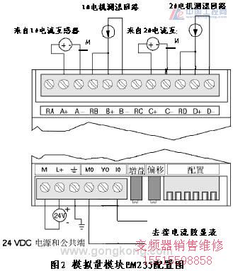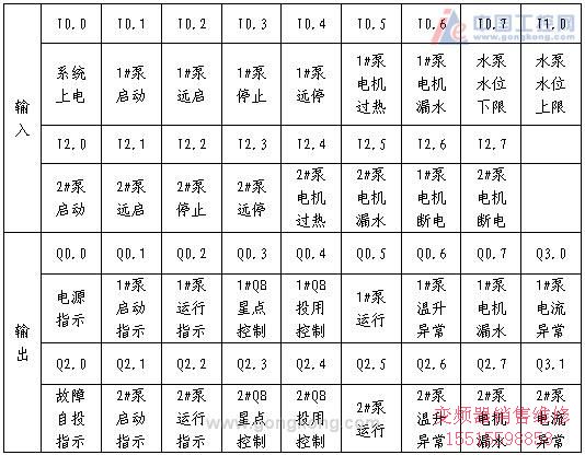 1、引言 冶金企業(yè)由于其生產工藝的特殊性,水泵的應用很廣泛。其中,一部分是各種類型的潛水泵。本文通過對西門子S7-200型PLC在潛水泵站控制系統的功能開發(fā)與應用,實現了潛水泵的降壓啟動,水位自動控制和兩泵故障互投控制,并集異地遠控、電機過載保護和漏水監(jiān)測、溫升異常檢測于一體,結合豐富的報警顯示功能,實現智能型無人值守泵站的功能。2、控制系統組成及其功能要求 在一般的進排水工作場合,因為對水壓與流量無嚴格要求,加之交流變頻控制和軟啟動裝置所需的一次性投資較大,所以水泵電機采用自耦變壓器降壓啟動控制,不失為一個好方案。自耦變壓器只是在啟動瞬間持續(xù)通電約10余秒鐘(視電機功率大小有所延長),即被切除,能耗問題可以忽略。電機主回路另設熱繼電器過載保護,互感器電流檢測。水泵電機(75Kw)主回路自耦降壓控制原理見圖1。 控制回路硬件組成:⑴PLC器件包括西門子S7-200系列224CPU模塊一只,擴展單元包括EM235模擬量模塊一只,4路輸入/1路輸出,開關量輸入輸出模塊EM223一只;⑵ 外設器件為液位控制器(JY-2A型)一套,電機自帶鉑電阻溫度傳感器兩只,電流互感器(150A/20mA)兩只及數顯電流表一只,按鈕、指示燈(DC24V)若干。模擬量模塊EM235硬件配置見圖2。 控制功能要求:兩潛水泵電機在水位處于所設定的上下限之間(潛水泵電機需浸水冷卻),電機無漏水情況和電機溫升無異常(不大于60℃)時,均能開啟任意一泵。若水位降至下限時,出于保護電機考慮,應自動停泵。當水位上升到下限時,水泵不應啟動,水位繼續(xù)上升至上限位時,水泵應自動開啟,開啟順序應以 1#泵優(yōu)先,1#泵因故未能運行,發(fā)出故障警報,通知維修人員前來處理,同時啟動2#泵投用。兩泵均不能正常投用時,為一級事故報警。水位處于上下限之間,在用泵發(fā)生因為電機漏水、溫升異常、電機過載保護動作、主回路空氣開關跳閘等情況,導致停泵時,要迅速啟動另一水泵投用。在啟動任意一臺水泵時,均要檢測該泵距上次啟動間隔時間,以保證間隔時間大于10分鐘時,才能再次啟動運行該泵。3、PLC程序設計 3.1 PLC I/O功能表 數字開關量輸入/輸出功能表見表1。模擬量由4路輸入1路輸出組成,分別是:1#和2#泵電機的負載電流與電機繞組溫度檢測;因為任何時間只有一臺泵運行,所以一路輸出作為電機負荷電流的數碼顯示,便于主控室操作人員查看。 表1