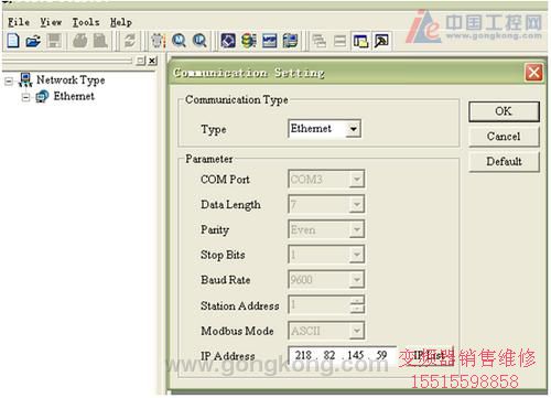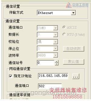 (1)在PC2上打開WPL軟件,在通訊設置中,選擇“Ethernet”,選擇指定IP為ADSL的IP地址:218.82.145.059。如果該IP地址下連接了多臺設備(RS485),則可通過圖8中的通訊站號來區(qū)分。可實現(xiàn)分別對各臺設備進行監(jiān)控操作。